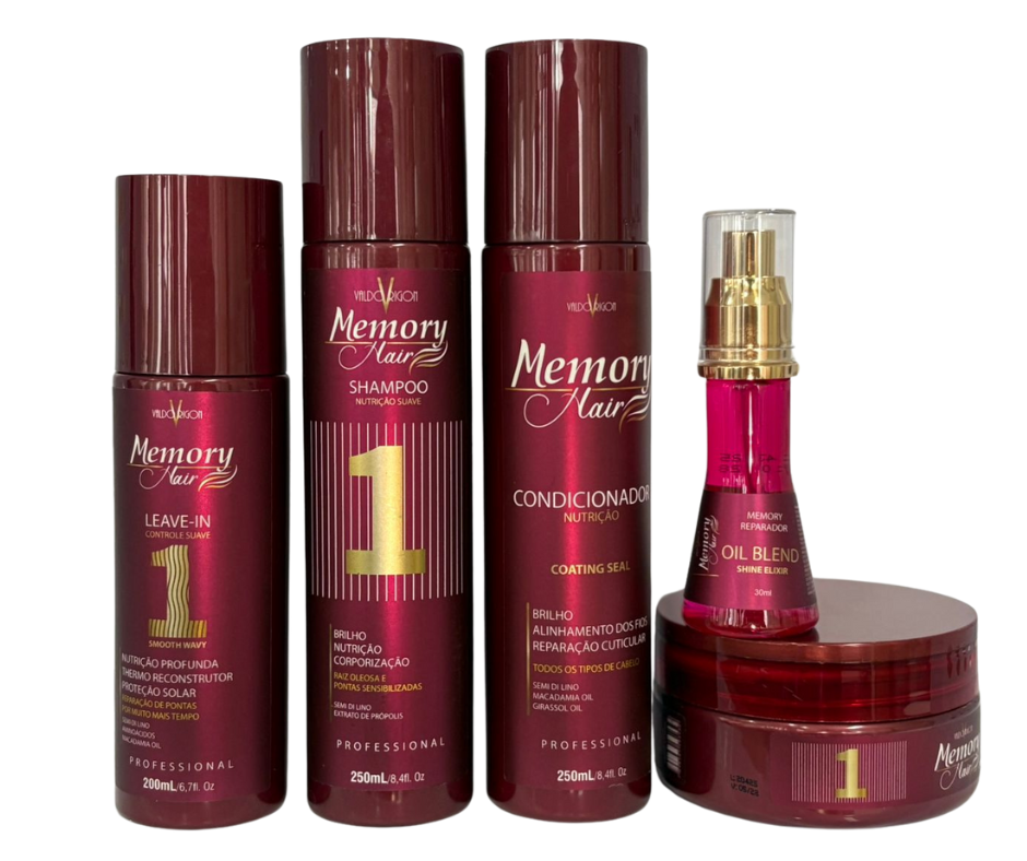 O Kit Memory 1 possui: Shampoo para Cabelos Lisos (ou Alisados) Memory 1, Condicionador Memory 1, Máscara de Reconstrução Capilar Memory 1, Protetor Térmico para Cabelos Memory Leave-in 1 e Reparador de Pontas Oil Blend Memory 1. É a linha certa para você que tem cabelos lisos ou alisados e sensibilizados ou com raízes oleosas!